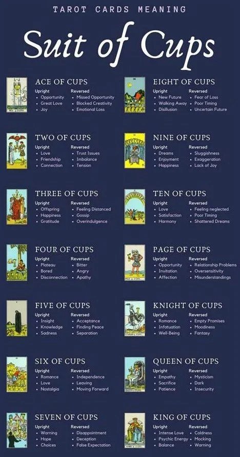 Cups - The suit of cups represents emotions and are the element of water.