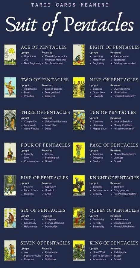 Pentacles - The suit of pentacles represents the material world and are the element of earth.