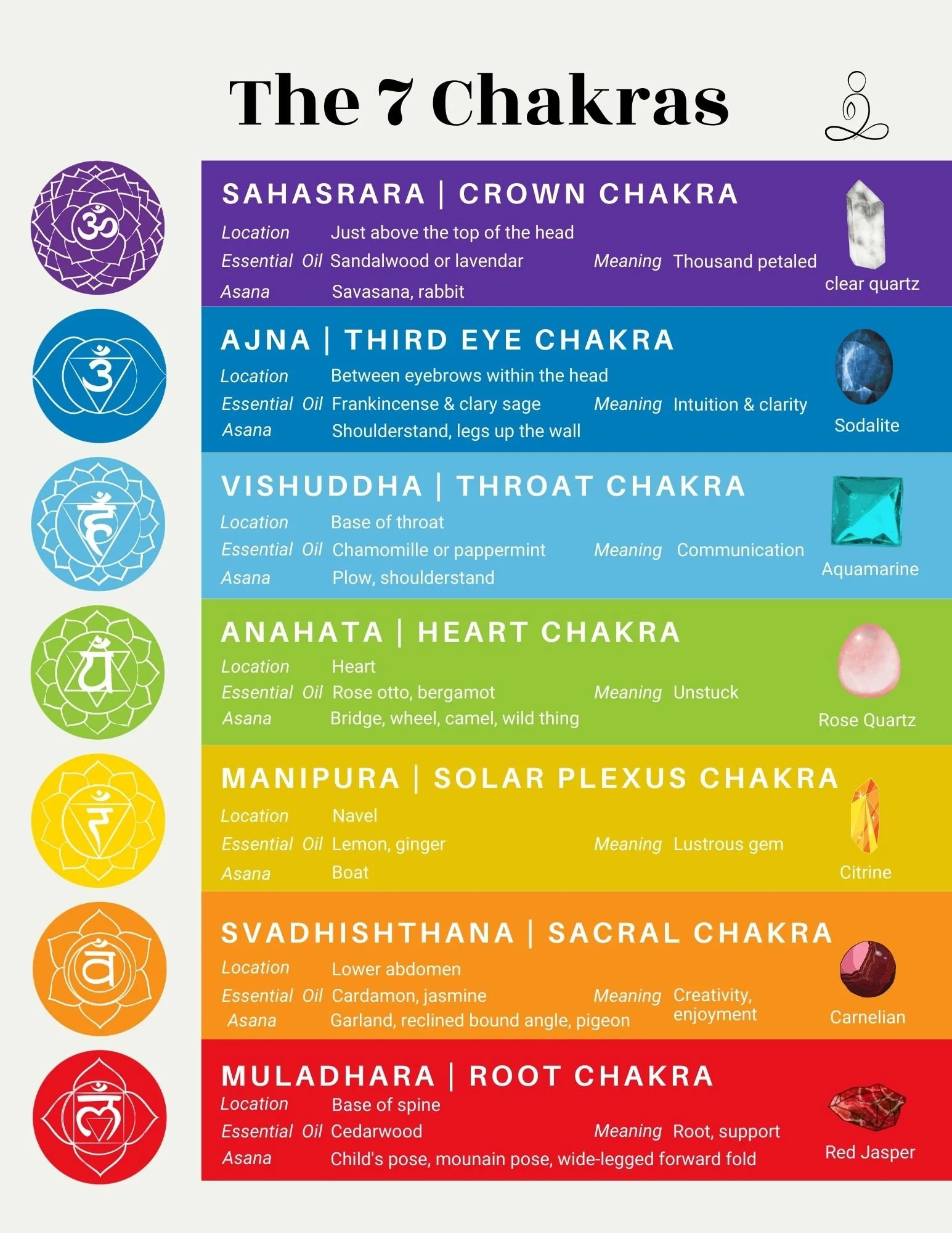 Below you will find a chart that breaks down the seven main chakras, their corresponding colors, and other modes of corresponding tools for the achievement of balancing the energy systems in the body.