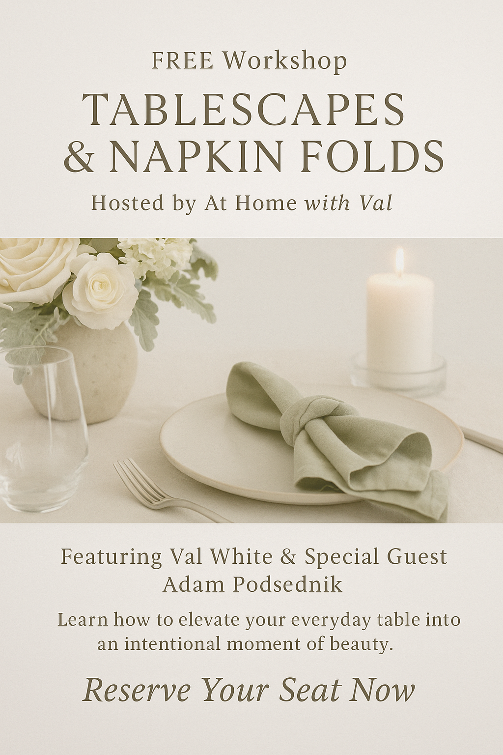Discover the art of gathering in style at Tablescapes & Napkin Folds, a free online workshop hosted by Val (with a special guest appearance by Adam).