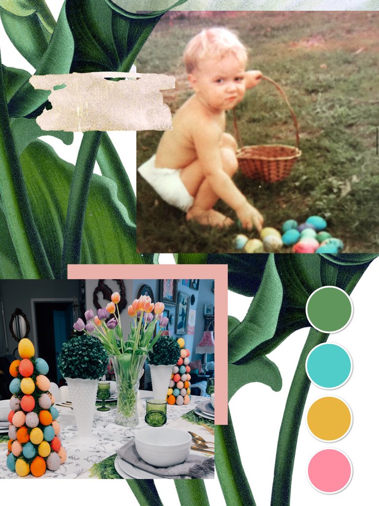The palette you see in the corner of this moodboard — that sage green, that dusty mauve, that warm gold, that unapologetic pink — is not a palette I chose from a color theory exercise. It is the palette of that photograph. Of that grass, those eggs, that particular quality of Florida light on a Sunday morning in April.