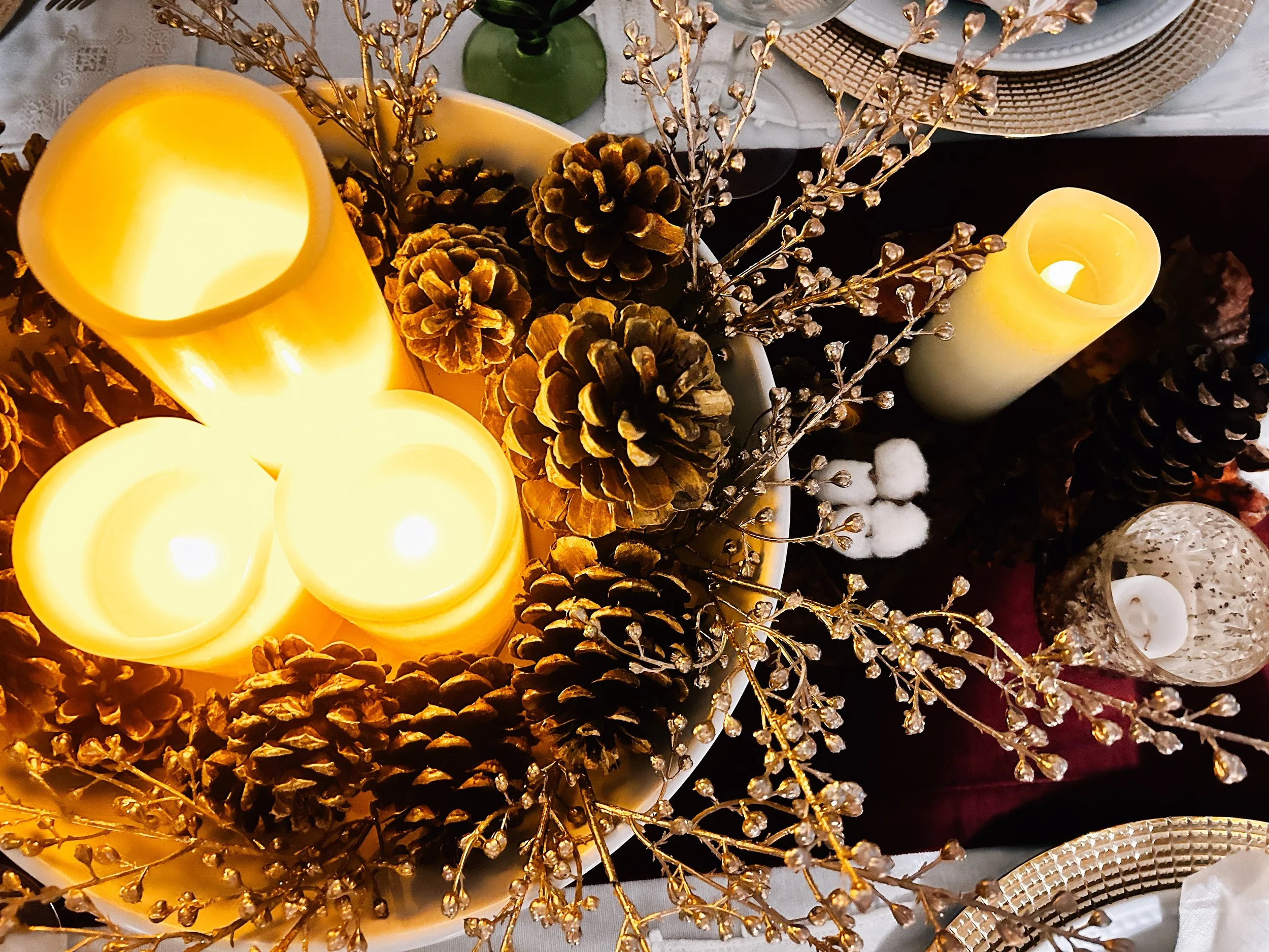 Years later, while living in Asheville, I set a table that felt like my grown-up version of those childhood autumns. I leaned into deep, warm tones: a rich burgundy runner, gold chargers catching the candlelight, and pinecones I painted in shimmering gold, arranged like little sculptures of the season. The centerpiece came alive with glowing candles nestled among gilded branches and pinecones, radiating warmth in every direction. My favorite detail was the pairing of those bold green glass goblets with the golden accents—unexpected, yet somehow exactly right, like the forest meeting the firelight.